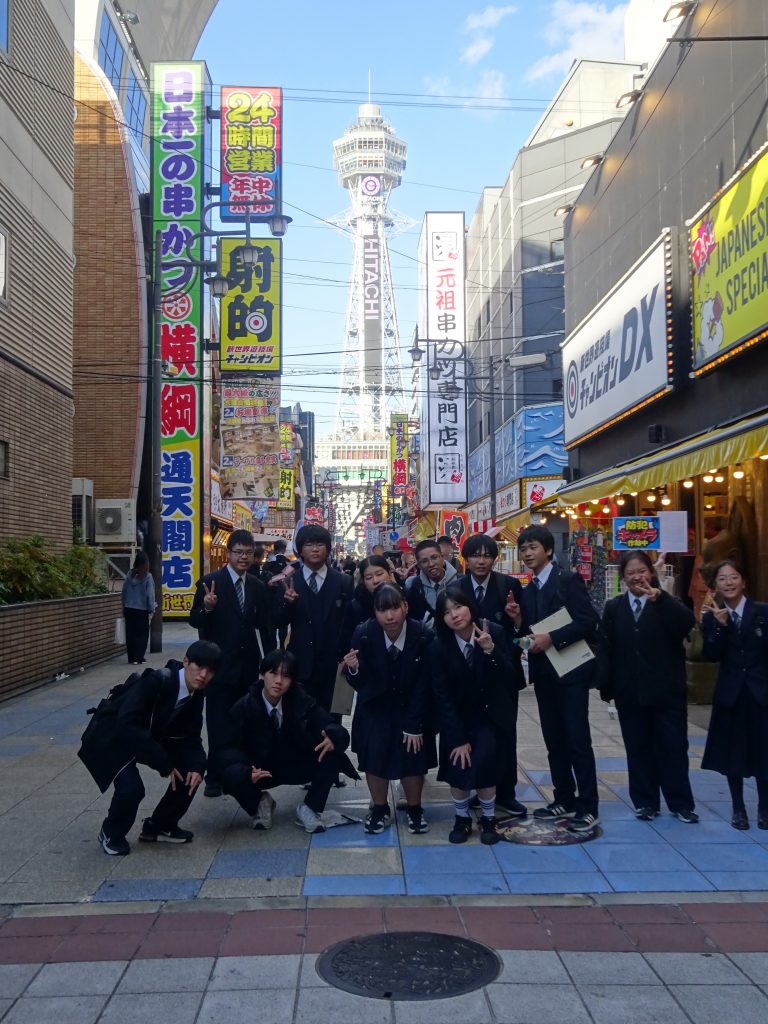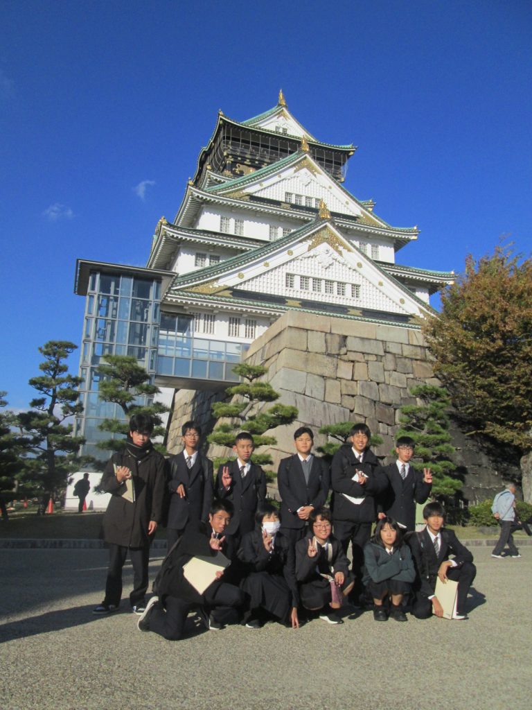 二日目は平和記念公園・資料館を見学しました。平和資料館では、原子爆弾による被害に衝撃を受けました。平和について、そのありがたさや平和を守り続けることの大切さを学びました。その後、新幹線で大阪に向かい、班別分散研修。大阪城、通天閣の二つの班に分かれて、生徒主導で移動しました。両班とも、無事にたどり着くことができました。