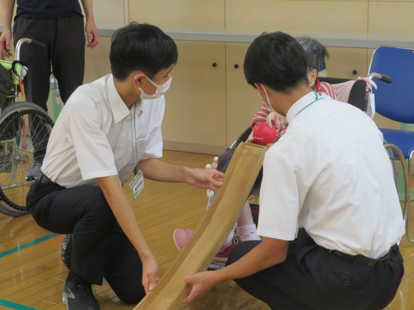 1年生Bグループに引き続き、9月22日(月)にAグループが地域の「愛厚希全の里」にレクリエーション交流に行きました。今回も、車いすや椅子に座る利用者さんと目線を合わせることを意識して、ボッチャを通